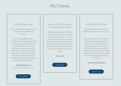 She has been teaching Pilates for ten years - both pilates classes and one to one, in which she offers a bespoke programme for anyone to recover from injury or illness.